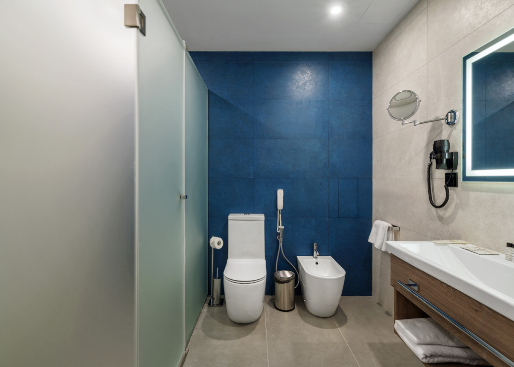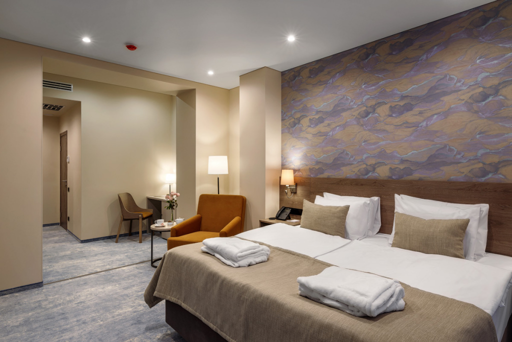 В номере: Кондиционер; Халат; Постельное бельё; Затемнённые шторы; Письменный стол; Холодильник; Фен; Отопление; Зеркало; Собственная ванная комната; Сейф; Душ; Тапочки; Чайник; Телефон; Туалетные принадлежности; Телевизор; Шкаф; Бутилированная вода
