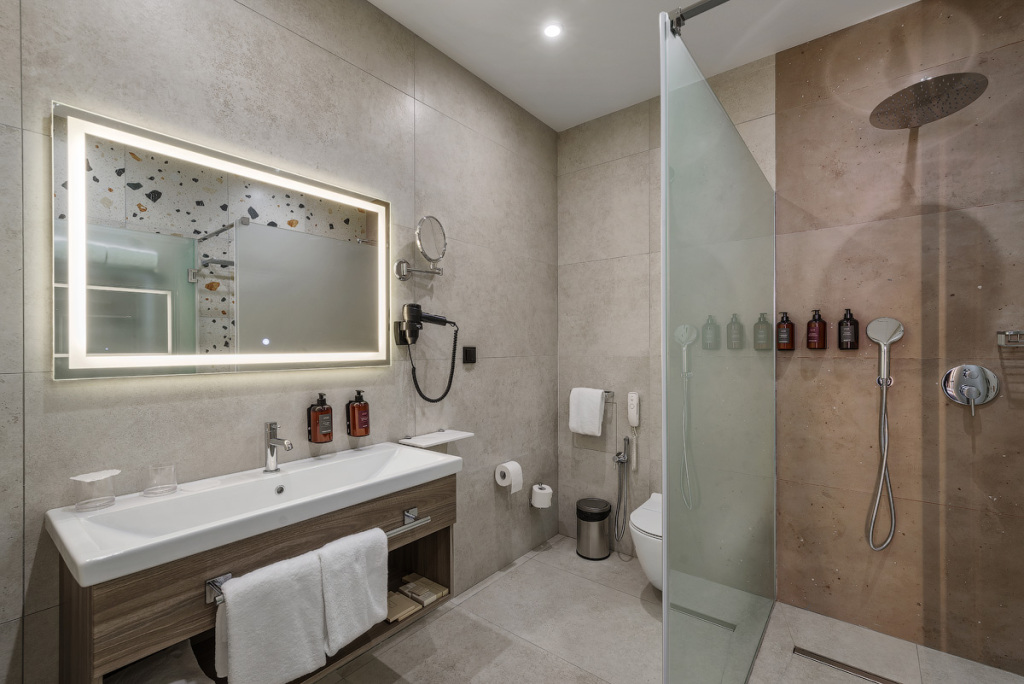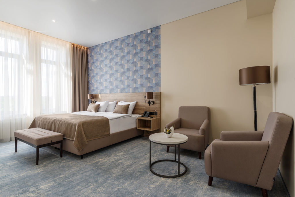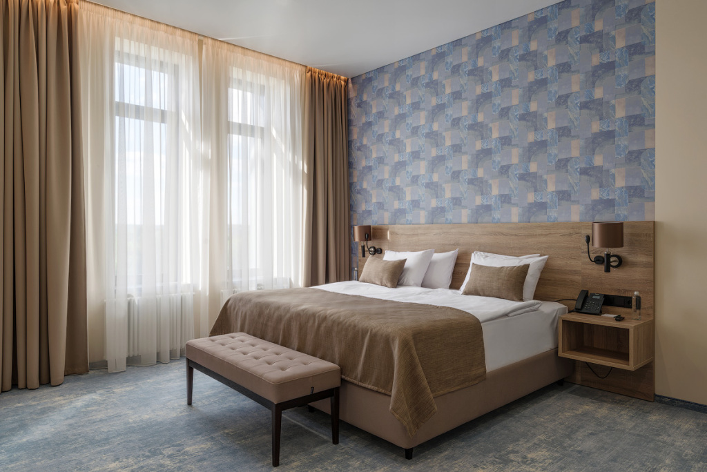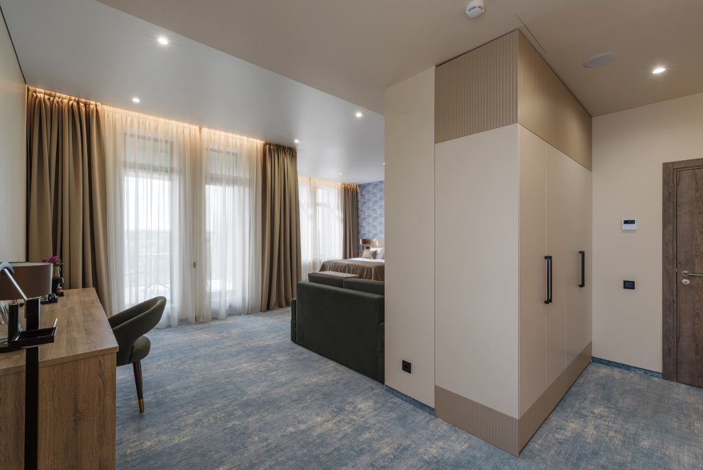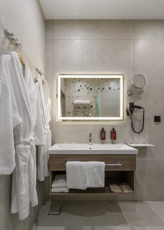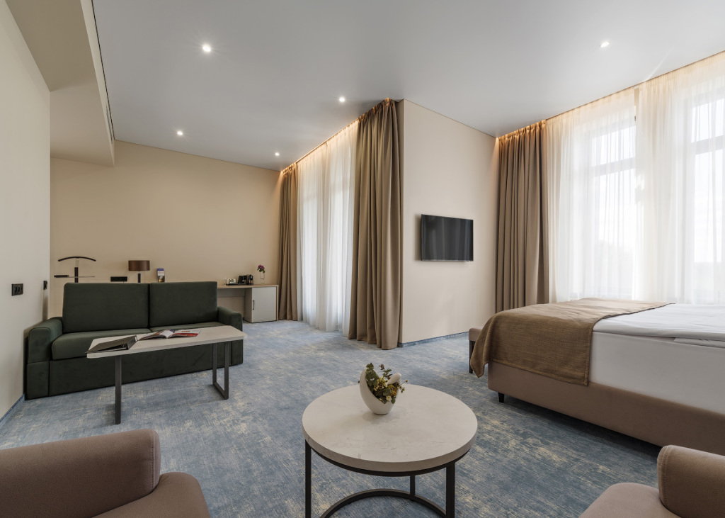 В номере: Кондиционер; Халат; Постельное бельё; Затемнённые шторы; Письменный стол; Холодильник; Фен; Отопление; Гладильные принадлежности; Зеркало; Собственная ванная комната; Сейф; Душ; Тапочки; Чайник; Телефон; Туалетные принадлежности; Полотенца; Телевизор; Шкаф; Бутилированная вода