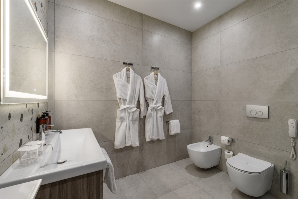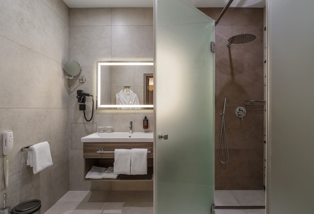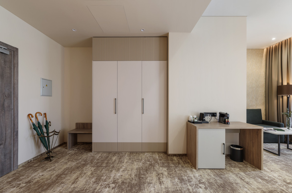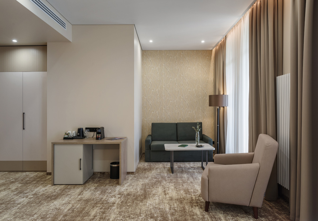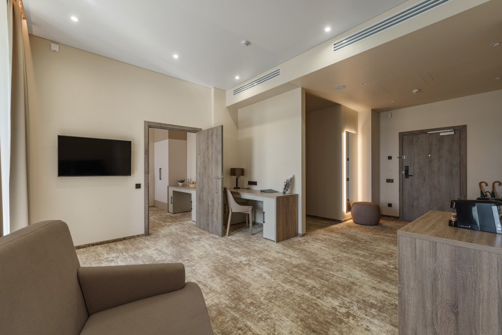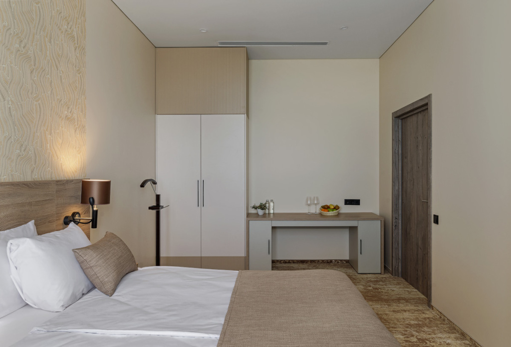 В номере: Кондиционер; Халат; Постельное бельё; Затемнённые шторы; Письменный стол; Холодильник; Фен; Отопление; Гладильные принадлежности; Зеркало; Собственная ванная комната; Сейф; Душ; Тапочки; Чайник; Телефон; Туалетные принадлежности; Полотенца; Телевизор; Шкаф; Бутилированная вода